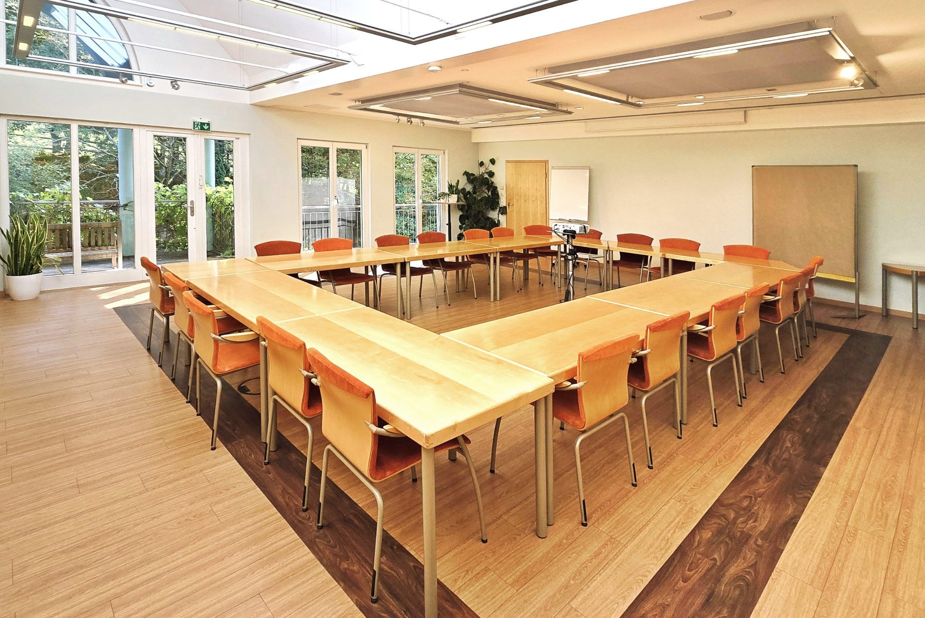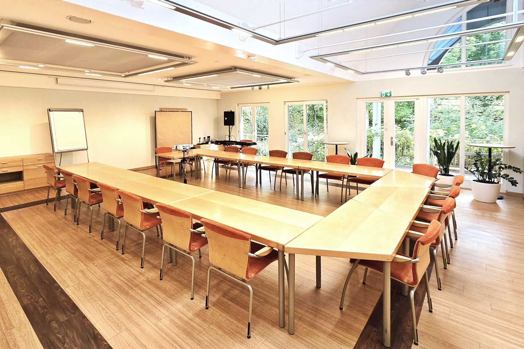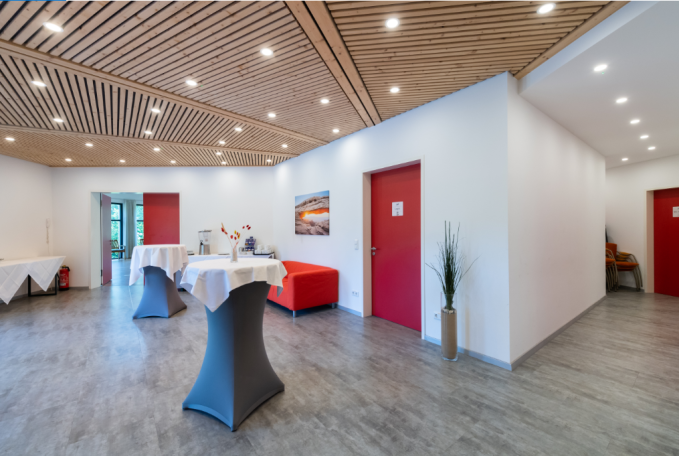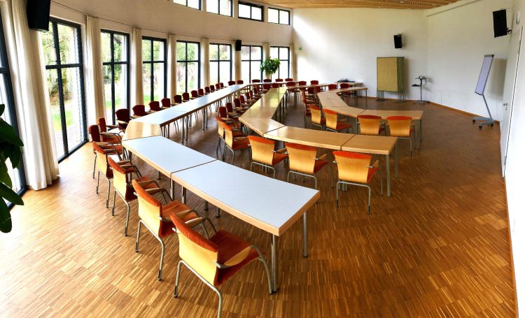 Je nach Gruppengröße lassen sich beide Seminarräume zu einem großen Raum verbinden. Der Raum vergrößert sich auf 140m². In der 2-Raum-Variante haben, abhängig von der Tischanordnung und Bestuhlung, bis zu 100 Personen Platz.